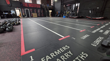 UK Supreme Fitness was chosen to supply and install a fully bespoke gym flooring solution for the Deadly Dozen Fitness race event HQ. The brief was to create a visually striking and extremely durable training and competition surface that matched the event’s black and red branding while standing up to constant sled work, running and high footfall.