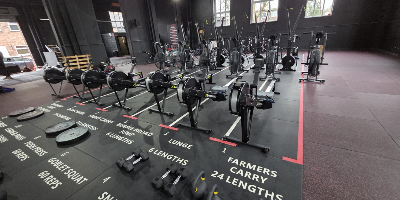 The install included 20mm red fleck rubber gym flooring tiles throughout the main training areas, custom Hyrox sled turf and astro turf zones, and fully bespoke rubber race lanes with inlaid markings. We also supplied key pieces of cardio equipment including Air Runners and Echo Bikes, chosen for their reliability, performance and suitability for high-volume race training environments.